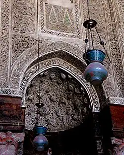 Медресе ан-Насира Мухаммада — одно из трёх медресе в Каире, где размещались все четыре суннитские школы права[4]. Медресе включает последний стукковый михраб (нишу, указывающую направление молитвы) в Египте, уникальный своими приподнятыми яйцевидными лепными выступами в горельефе с перфорированным орнаментом, украшающим козырёк михраба[4]. Этот стиль очень напоминает лепнину, изготовляемую в иранском Тебризе при монгольском правлении Ильханидов, и историки предполагают, что она была создана мастерами из монгольского Ирана или Тебриза[2][3][5]. Кроме михраба, в целом в интерьере здания сохранилось сравнительно мало украшений[3].