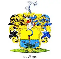 В архиве г. Пскова удалось найти описание герба дворян фон Мейеров: «На поперёк разделённом щите в верхней половине находится стоячий, обращённый направо, зубастый серп, с деревянной ручкой. В нижней синей половине являются три из зелёной воды поднимающиеся золотые колоса. На щите лежит турнирский, открытый на правую сторону обращённый шлем синеватого цвета с красной подкладною золотою короною и висящим покрывалом. Одно с правой стороны чёрного цвета с золотом, а другое с левой стороны синего цвета с золотом. Из этого, украшенного драгоценными камнями шлема, выходит обращённая на правую сторону вооружённая рука, которая держит шестиугольный приклад».