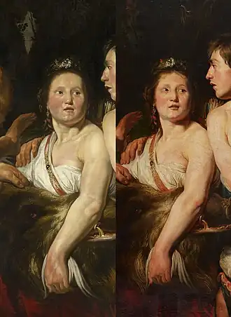 Якоб Йорданс. Мелеагр и Аталанта. Ок. 1618 год (авторское увеличение картины — ок. 1660). Дерево, масло, 73,0 х 98,0 см. Лихтенштейн, княжеская коллекция. Вена (инв. GE 108)