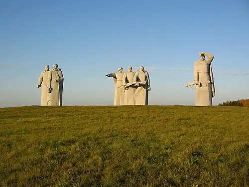 Комплекс разбит на три части. Спереди располагается скульптура («Вперёдсмотрящий») политрука, вглядывающегося в даль из-под руки. В отдалении — две скульптуры бойцов, сжимающих в руках противотанковые гранаты. В центре — композиция «Клятва на верность Родине», состоящая из трёх скульптур воинов с лицами, преисполненными решимости[2].