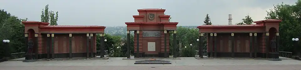 Во время войны монумент был сильно поврежден: были разбиты мраморные плиты, бронзовые скульптуры и ценные строительные материалы были вывезены в Германию. Согласно решению Ворошиловградского горисполкома от 12 июня 1943 реконструкцию памятника было поручено выполнить автору сооружения Александру Шеремету и скульпторам Артюшенко, Ткаченко и Трегубовой. Памятник был окончательно восстановлен в 1945 году.