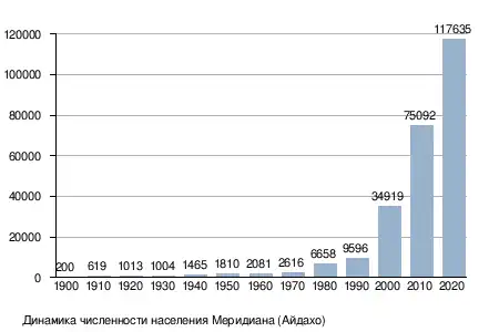 Меридиан является вторым по величине городом в округе после Бойсе и третьим по величине в штате — после Бойсе и Нампы. На 2010 год население Меридиана составляло 75 092 человека[7]. Меридиан является самым быстрорастущим городом штата: по сравнению с 1990 годом (9 596)[8] население увеличилось на 683 %. Меридиан расположен на возвышенности примерно в 800 метров. Площадь города составляет 88,15 км². Ниже приведены динамика численности населения[9][10] и климатограмма Меридиана.