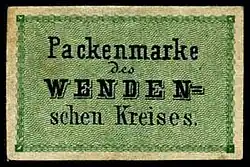 …в Венденском уезде Лифляндской губернии существуют особо установленные марки стоимостью в 2 копейки разных цветов для пересылки корреспонденции по уезду, посредством особых посыльных по 2 раза в неделю. …Марки эти, как оказывается теперь, не были до введения их представлены на утверждение г. министру внутренних дел.