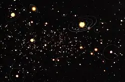 Диски космической пыли (пылевые диски) окружают многие звёзды и могут быть обнаружены благодаря поглощения пылью обычного света и переизлучения его в инфракрасной области. Даже если общая масса частиц пыли меньше массы Земли, они могут занимать достаточно большую площадь и затмевать родительскую звезду в инфракрасном диапазоне[57].