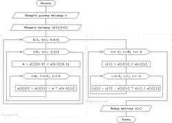 Блок-схема представлена на рисунке. Данный рисунок — адаптированный для написания программы на языке C/C++, где a — расширенная матрица, последний столбец в которой — столбец свободных членов. Количество строк — n.