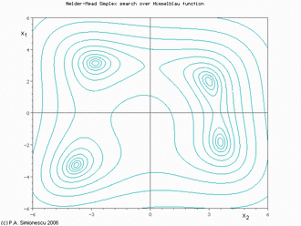 ![]() Последовательные симплексы в методе Нелдера-Мида для функции Розенброка (вверху) и функции Химмельблау (внизу) | |