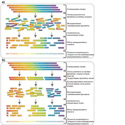 В процессе сборки исходной последовательности ДНК перекрывающиеся прочтения собираются в более крупные последовательности, называемые контигами. Контиги представляют собой непрерывные части восстанавливаемой последовательности ДНК. Контиги в свою очередь объединяются в ещё более крупные последовательности — скаффолды — которые уже не обязательно являются непрерывными частями исходной ДНК и могут содержать пропуски. Если секвенирование проводилось методом парных прочтений, то расстояние между контигами в скаффолде может быть выведено на основании информации о позиции спаренных прочтений[10]. В зависимости от расстояния между контигами могут быть использованы различные методы для заполнения пропусков в скаффолдах. Если зазор мал (5—20 т.п.н.), то данная область амплифицируется с помощью ПЦР, а затем секвенируется. Если зазор большой (> 20 т.п.н.), то пропущенный фрагмент клонируют в специальных векторах, таких как искусственная бактериальная хромосома, с последующим секвенированием вектора[11].