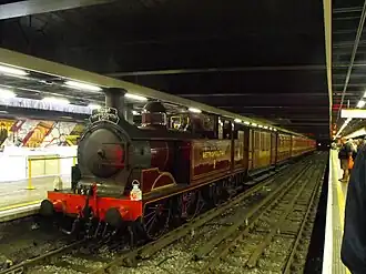 В первом в мире Лондонском метрополитене изначально эксплуатировались паровозы с прицепными вагонами. На фото — паровоз класса Е с поездом на станции Моргейт, открытой в 1865 году