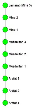 - Розовая линия (этап 1) — от моста Джамрат (место ритуала бросания камней) до Мины, Муздалифы и Арафата, имеет пересадку на Красную и Синюю линии в Мине.