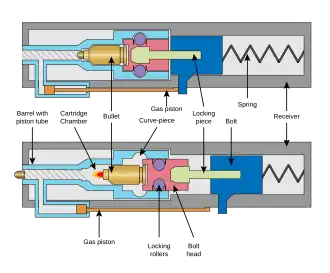 В немецком пулемёте MG-42 применялось роликовое запирание при автоматике, работавшей от отдачи ствола с коротким ходом.