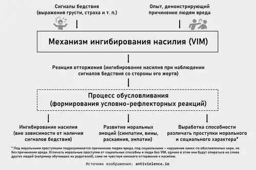 Аналогично обстоит дело и с ингибированием насилия. Ещё в детстве нормально развивающийся индивид при каждой попытке совершить действия насильственного характера будет сталкиваться с активацией VIM ввиду соответствующей реакции жертвы. Со временем к этому начнёт приводить даже сама мысль о насилии и вероятность проявления насильственного поведения индивидом будет постепенно падать.