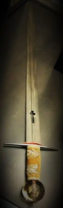 Длина клинка меча — 76 см, ширина в самом широком месте составляет 45 мм, на клинке имеется отверстие в форме креста (45 х 20 мм). Деревянная рукоять меча покрыта желто-коричневой тканью и бархатом, расшитым орнаментом из толстой серебряной нити в виде лавровых ветвей.