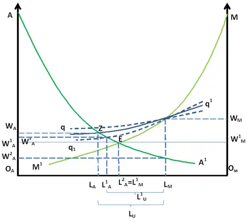 • таким образом, при нейтральном отношении мигранта к риску в точке устанавливается равновесный уровень пересечения кривых и , где определяется уровень занятых в аграрном секторе и занятых в промышленности на уровне занятых , зарплата в аграрном секторе и уровень безработицы ;
