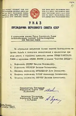 - ↑ Министерство обороны. Кадровый приказ. Портал "Память народа". Дата обращения: 20 февраля 2022. Архивировано 20 февраля 2022 года.