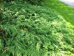 Хвоя обычно чешуевидная, овальной формы, около 2 мм в длину, хотя на внутренних затенённых побегах иногда бывает и игловидной[7].