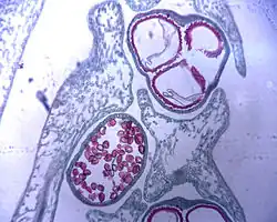 Формирование микроспоры начинается в пыльниках. Сначала в молодом пыльнике образуется спорогенная ткань – археоспорий, который делится и становится материнской клеткой пыльника, что называется – микроспороцитом. Микроспороцит делится мейотически в результате чего создается 4 гаплоидные клетки микроспор, которые называются – тетрадами. Когда эти тетрады созревают они распадаются на отдельные микроспоры, микроспоры быстро делятся и образуют внутренние клетки и наружную оболочку.