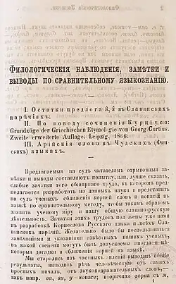 - «Филологические наблюдения, заметки и выводы по сравнительному языкознанию» («Филологические записки», 1869—1871 гг.)[5];