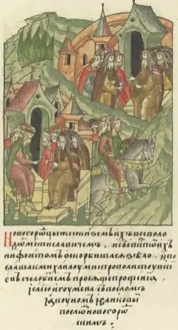 Около 1134 года он прибыл в Новгород и именем Божиим удерживал новгородцев от вражды с ростовскими князьями. Но новгородцы не послушались митрополита и, задержав его у себя, выступили в поход. Однако потерпели поражение и, возвратившись из похода, отпустили митрополита.