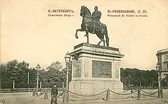 - В 1800 году на площади Коннетабля перед замком был установлен памятник Петру I с надписью «Прадеду правнук», отлитый в 1745—1747 годах по модели скульптора Б. К. Растрелли, сделанной ещё при жизни Петра I. Облицованный мрамором пьедестал высечен архитектором Ф. И. Волковым. На нём укреплены бронзовые барельефы «Полтавская баталия» и «Бой при Гангуте», созданные молодыми скульпторами В. И. Демут-Малиновским, И. И. Теребенёвым и И. Е. Моисеевым при руководстве М. И. Козловского.