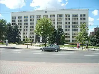 Здание обкома построено в 1973 году (архитекторы А. Кучеренко, Ю. Шпит). Симметричная объёмно-пространственная композиция кирпичного здания состоит из 8-этажного прямоугольного в плане объёма и соединённого с ним со стороны дворового фасада 2-этажного прямоугольного в плане зала заседаний (на 400 мест).