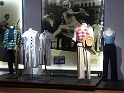 Другой спортивной одеждой был тогдашний костюм для тенниса, выполненный в белой гамме[29] и сохранивший свои атрибуты с предыдущих лет[30]: фланелевые или суконные брюки, опоясанные ремнём, полотняная, фланелевая или пикейная рубашка с короткими рукавами (либо же длинными, закатанными по локоть)[30][31][32] и мягкие туфли на кожаной или каучуковой подошве без каблука[30]. Вышеупомянутые ткани, использовавшиеся в теннисном костюме, были жёсткими, придавали громоздкость и неудобство ношения подобной одежды[31]. Революцию в фасоне теннисных рубашек (позднее получивших название «поло») в середине данного десятилетия произвёл великий французский теннисист Рене Лакост, самостоятельно разработавший эскиз наиболее удобного для игры фасона рубашки: с короткими рукавами, отложным воротником и застёжкой на ряд пуговиц. Изготовлена такая рубашка была из лёгкого хлопкового пике. Впервые в такой рубашке Лакост выступил на открытом чемпионате США по теннису в 1926 году, произведя таким образом фурор, и в итоге несколько лет спустя Лакост создаст одноимённый бренд одежды, а крокодил, послуживший прозвищем теннисиста и присутствовавший на рубашке в виде нашивки, станет логотипом бренда[31][32][33]. В СССР в те годы теннис считался «буржуазным» видом спорта (что имело под собой основания, так как до революции теннис был уделом аристократии и upper-middle class, в отличие от футбола, полюбившегося пролетариату и среднему классу в целом и потому в советские годы считавшемуся демократическим видом спорта), и, соответственно, такой костюм широкого распространения не получил[29][30] (а Е. Ф. Корш[кто?] и вовсе вспоминал, что однажды, будучи в те годы на параде физкультурников в составе команды теннисистов, её, посчитав за «буржуев», закидали гнилыми картофелинами[29]). Хотя в то же десятилетие в СССР появляется трикотажная спортивная рубашка с короткими рукавами, в широкую полоску и застёжкой на шнурках. Данный фасон стал первой своего рода собственно отечественной спортивной рубашкой, и получит широкое распространение уже к началу следующего десятилетия. Такие рубашки, хорошо известные по кинофильмам и картинам, впоследствии стали называть теннисками, хотя в данное десятилетие из-за вышеупомянутой «буржуазной» ассоциации с теннисом её официально называли футболкой[29] (хотя настоящие футболисты того времени больше носили рубашки с длинными рукавами).