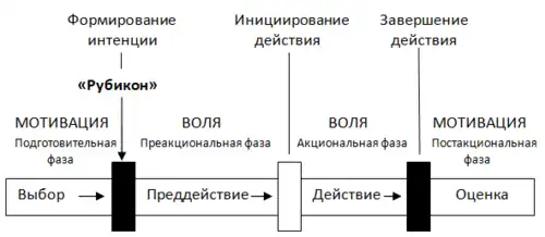 - Подготовительная мотивационная фаза (фаза формирования интенции). В данной фазе происходит обдумывание возможных альтернатив действия и формирование интенции на достижение определённой цели (целевая интенция).
