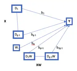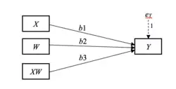 В этом случае роль как модератора достигается путём оценки , параметра для члена взаимодействия[2].