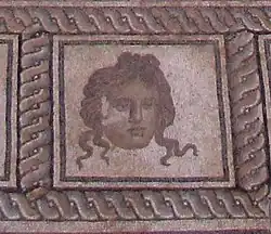 Верхние (западные) маски мозаики Диониса представляют молодого сатира (слева) и старого Силена справа. Центральная маска — это лицо голубоглазой женщины с вьющимися волосами. Возможно, это нимфа Фетида, спасительница Диониса.
