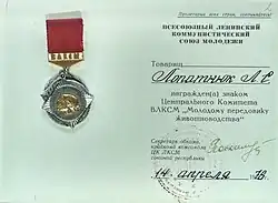 - ↑ А. И. Песин. История ленинского комсомола в фалеристике. — Орел, 2003.