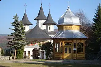 Кладбищенская церковь. В 1987 году в монастырь была перенесена деревянная церковь из села Хлапешти коммуны Драгомирешти Нямецкого уезда. По причине ветхости, она была полностью перестроена в 1987—1999 годах с сохранением старой планировки. 7 августа 1999 года освящена в честь Воскресения Христова и святого евангелиста Иоанна Богослова[3].