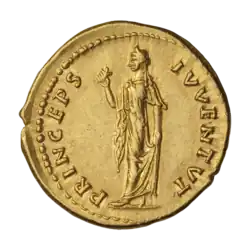 Веспасиан пришёл к власти в возрасте 60 лет. Пожилой император объявил о создании династии Флавиев[37]. На его монетах нашли отображение изображения и/или титулы сыновей Веспасиана — Тита и Домициана вместе[38] или по отдельности[39]. Количество монетных типов с изображениями предполагаемых наследников насчитывает несколько десятков. Продолжая заложенную Августом практику, им был присвоен титул «предводителей молодёжи» (лат. princeps juventutis), что и нашло отображение на монетах[40][41].