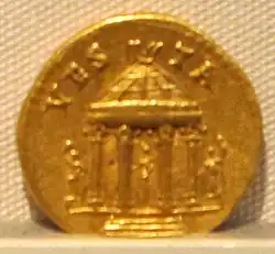Правление Веспасиана ознаменовано грандиозным строительством в пережившем в 64 и 68 годах пожары Риме. Попытка увековечить своё правление бурной архитектурной деятельностью находила своё отображение на монетных типах римских императоров[89]. Из множества отстроенных зданий на монеты попали храм Весты[90] и Юпитера Капитолийского[91]. Проникновение восточных культов в религию римлян нашло отображение в изображении храмов Изиды и Сераписа[92][93].