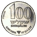 100 прут | 28,5 | 11,3 | Аверс: финиковая пальма; текст «Израиль» на иврите и арабском языке; Реверс: цифра «100»; текст «прута» и год выпуска на иврите; две стилизованных ветви оливы по кругу. |