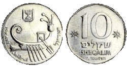 10 шекелей | 26 | 8 | Аверс: древняя галера; герб Израиля; текст «Израиль» на иврите, арабском и английском языках. Реверс: цифра «10»; текст «шекелей» и год выпуска на иврите; две стилизованных восьмиконечных звезды. |