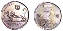 5 фунтов | 30 | 11,2 | Аверс: рычащий лев; герб Израиля; текст «Израиль» на иврите, арабском и английском языках; Реверс: цифра «5»; текст «израильских фунтов» и год выпуска на иврите; две декоративные восьмиконечные звезды. |
