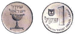 1 шекель | 23 | 5 | Аверс: чаша и текст «израильский шекель» на иврите Реверс: Герб Израиля; цифра «1»; текст «шекель» на иврите; текст «Израиль» на иврите, арабском и английском языках; дата выпуска на иврите. |