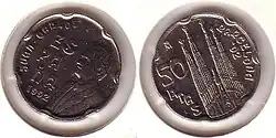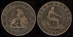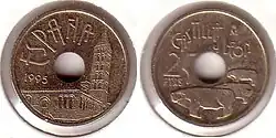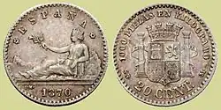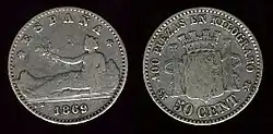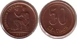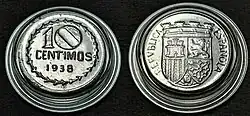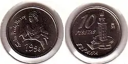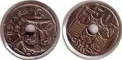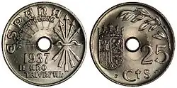 Вторая Испанская Республика в течение 1930-х годов выпускала монеты номиналом 5 сентимо из железа, 25 сентимо из медно-никелевого сплава и меди, 50 сентимо также из меди и 1 песету из серебра и латуни[1][2].