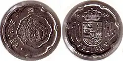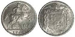 В 1939 году режим Франко изъял из обращения монеты из драгоценных металлов и стал чеканить монеты, схожие по дизайну на монеты югославского динара. В 1940-х годах появились монеты номиналом в 5, 10 и 25 сентимо, 1 и 5 песет. В 50-х годах появились монеты номиналом 50 сентимо и 2,5 песеты. В 1958 году из-за инфляции в обращение были введены монеты большей номинальной стоимостью 25 и 50 песет, а затем и 100 песет (1966 год) из серебра 800-й пробы[1][2].