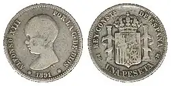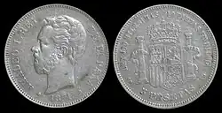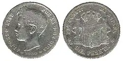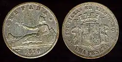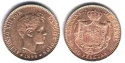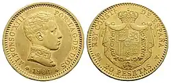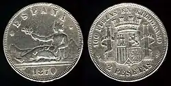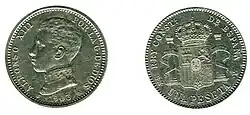 Первая песета, которая была отчеканена в 1869 году, имела вес 5 граммов серебра. Также чеканились разменные монеты номиналом 1, 2, 5 и 10 сентимо из меди и 20 и 50 сентимо из серебра 835 пробы. Монеты номиналом 1 и 2 песеты также чеканились из серебра 835 пробы, а номиналом в 5 песет — из серебра 900 пробы. Номиналы в 10, 20, 25 и 100 песет (1897 год) чеканились из золота 900 пробы[1][2].