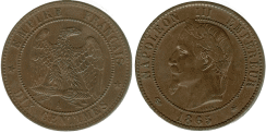 | 1861 | Бронза | 10 г | 30 мм | 1861 — 1870 | рубчатый | Орёл | Наполеон III | Всего выпущено: — 52 060 108 шт |