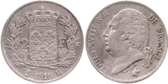 | 1816 | Серебро | 10 г | 27 мм | 1816 — 1824 | рубчатый | Номинал | Людовик XVIII | Всего выпущено: — 3 681 787 шт. |