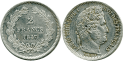 | 1845 | Серебро | 2 г | 18 мм | 1845 — 1848 | рубчатый | Номинал | Луи Филипп | Всего выпущено: — 9 581 743 шт. |
