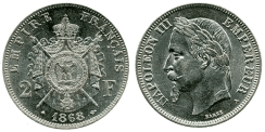| 1853 | Серебро | 2 г | 18 мм | 1853 — 1863 | рубчатый | Номинал | Наполеон III | Всего выпущено: — 1 009 907 шт. |