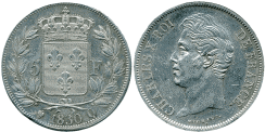 | 1825 | Серебро | 5 г | 23 мм | 1825 — 1830 | рубчатый | Номинал | Карл X | Всего выпущено: — 5 277 137 шт. |
