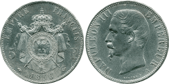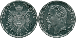 | 1853 | Серебро | 5 г | 23 мм | 1853 — 1866 | рубчатый | Номинал | Наполеон III | Всего выпущено: — 25 946 691 шт. |