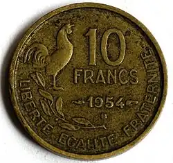 После войны дизайн монет образца 1934—1940 годов не изменился, в обращении были монеты с номиналом 50 сантимов, 1, 2 и 5 франков, выпускаемые из более дешёвого алюминия. В результате продолжавшейся инфляции в 1950 году были введены новые монеты с номиналами: 10, 20, 50 и 100 франков. Банкнота номиналом 50 франков была выведена из обращения. Впервые введена в обращение банкнота номиналом 10 000 франков.
