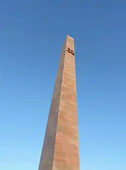 Гранитный обелиск 48 метров высотой образует главную ось монумента. С южной стороны на нем изображены цифры: 1941—1945, означающие годы Великой Отечественной войны. Красный бородинский гранит для обелиска добывался под Выборгом. На сооружение ушло 236 гранитных блоков, уложенных в 40 ярусов. Высота каждого яруса 1,2 метра. Первый из блоков в основание обелиска заложили 18 января 1975 года, последний — 19 марта. Вес конструкции составил 1600 тонн.