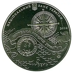 На аверсе: вверху — малый государственный герб Украины и надпись «НАЦІОНАЛЬНИЙ БАНК УКРАЇНИ». Композиция, разделённая волнообразной лентой с надписью «МОРСЬКА ІСТОРІЯ УКРАЇНИ»: вверху — роза ветров и год чеканки (2010), внизу — печать Войска Запорожского, логотип Монетного двора НБУ, надпись «5 ГРИВЕНЬ». На реверсе: казацкий чёлн первой половины XVIII века, слева от него — чайка. Надписи «КОЗАЦЬКИЙ ЧОВЕН XVIII ст.». |