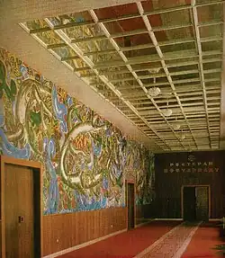 В большом вестибюле имелись бесшумные, скоростные лифты и парадная лестница, соединявшаяся с жилыми помещениями гостиницы. Раскрывавшееся во внутренний дворик фойе гостиницы было украшено росписью народного художника Азербайджана Тогрула Нариманбекова. Из фойе можно было пройти к ресторанному и банкетным залам[5].