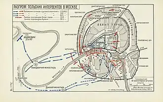 Конные сотни Второго ополчения в течение пяти часов сдерживали наступление гетманской армии. Наконец, они не выдержали и подались назад. Отступление конных сотен было беспорядочным, дворяне вплавь пытались перебраться на другой берег. Князь Пожарский лично покинул свой штаб и попытался остановить бегство. Это не удалось, и вскоре вся конница ушла на другой берег Москвы-реки. Одновременно центру и правому флангу гетманской армии удалось оттеснить людей Трубецкого. Все поле перед Земляным городом осталось за гетманом. После этого начался штурм полуразрушенного Земляного города. Гетманская пехота выбила русских с валов. Продолжая развивать успех, венгерская пехота и казаки Зборовского захватили Климентьевский острог и посекли всех его защитников[14]. В захвате острога участвовал и гарнизон Кремля, который сделал вылазку для поддержки наступления. Гетман сам руководил этим наступлением. Свидетели вспоминали, что гетман «скачет по полку всюду, аки лев, рыкая на своих, повелевает крепце напрязати оружие своё»[15].